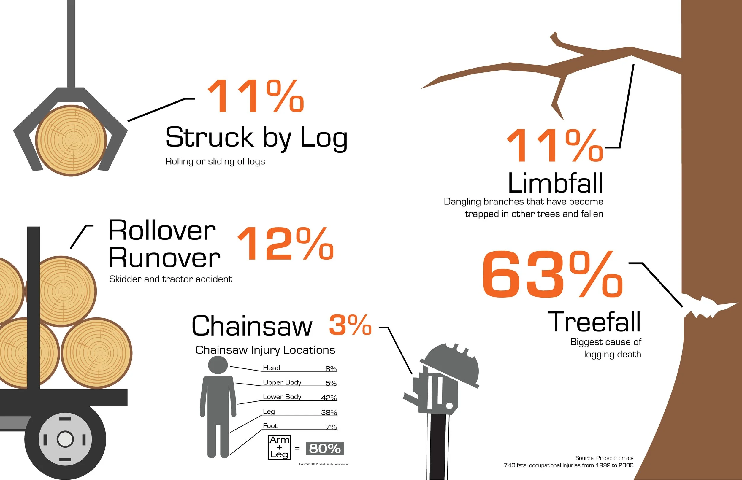 According to statistics from the Bureau of Labor Statistics, the logging industry had 110.9 injuries and 78 deaths in 2014. Logging workers are 30 times more likely to die than the average American worker.